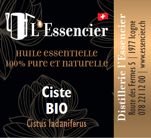 Particularité de la plante : Le Ciste (Cistus ladanifer) est un arbuste méditerranéen que l'on trouve principalement en Espagne, au Portugal et en Corse. Son huile essentielle est extraite par distillation à la vapeur d'eau de ses feuilles et rameaux. Elle est reconnue pour ses propriétés régénérantes et cicatrisantes, ainsi que pour son parfum balsamique et résineux.