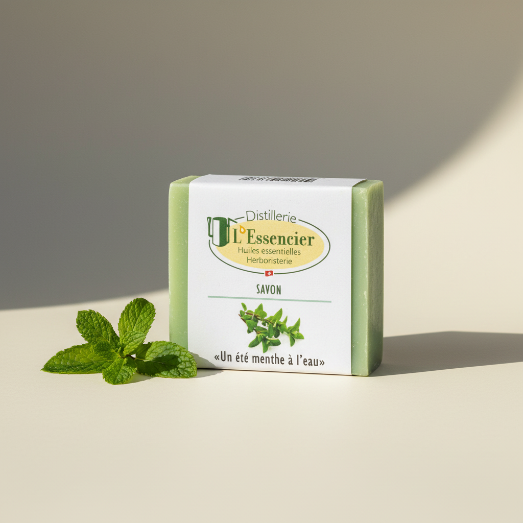 Découvrez notre savon solide "Un Été Menthe à l'Eau", fabriqué avec des huiles biologiques de qualité supérieure.